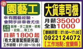 • 有園藝經驗,會開手排車尤佳(有大貨車駕照薪另議),工作時間:07:00~16:00,工作內容:割草、手工除草、修剪、砍除...等工作,聯絡時間:07:00~17:00