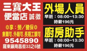 • 上班時間08:00~13:30,享:勞/健保,兼職可.外籍可.長期工讀可