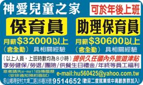 • 工作職缺: 保育員(可於年後上班)