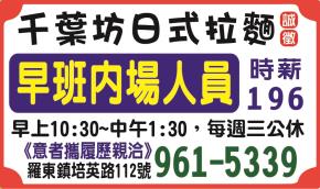 • 上班時間:早上10:30~中午1:30(每週三公休),意者攜履歷親洽
