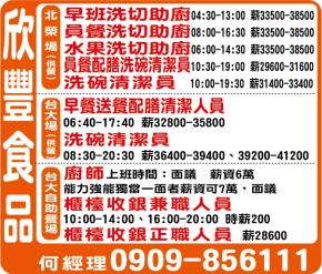 • 工作職缺: 早餐送餐配膳清潔人員 06:40-17:40 薪資:32800-35800