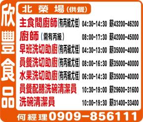 • 北榮場(供餐) 主食間廚師 04:30-14:30(有丙級尤佳) 薪資:43200-46200