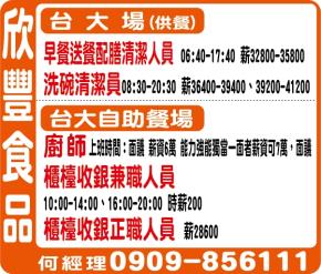 欣豐食品 誠徵 北榮場(供餐)高薪