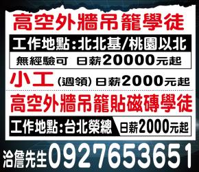 • 工作職缺: 高空外牆吊籠師父(工作地點:北北基/桃園以北)(電洽0927653651詹先生)
