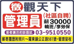 • 輪班/享勞保,意者請洽約談面試~郵寄履歷附照片~宜蘭縣羅東鎮公正路561號-管理室收