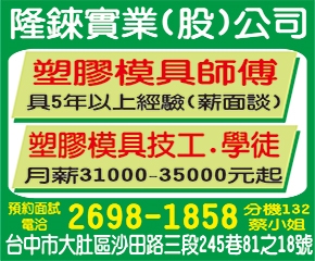 • 塑膠模具師傅需具5年以上經驗(薪面談)