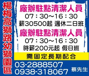 • 工作職缺: 廠辦駐點清潔人員/假日班