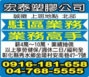 • 工作職缺: 🛵駐區業務/業務高手【宏泰塑膠公司誠徵】